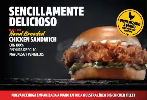 100% pechuga de pollo empanizada, mayonesa y pepinillos.